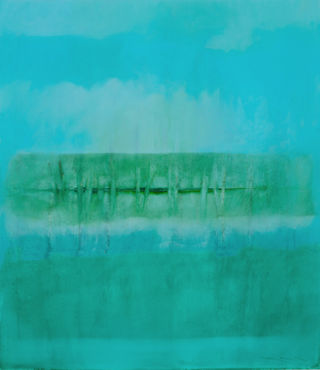 The resulting acid-washed tin creates a fluid, reflective ground for the oil-painted landscape image, which is built through layered glazes. Rather than depicting a specific location, each painting evokes a remembered watery landscape—one shaped by color, light, and movement, and formed through the combined actions of the acid wash and the painterly surface.